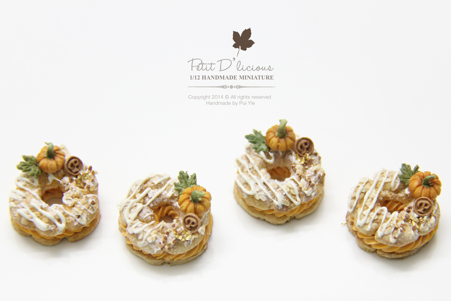 I'm so happy to work on these new fall themed desserts.~Pumpkin Paris Brest that I had completed in dollhouse miniature scale 1:12 with all the realistic details. I had handsculpture a little lovely pumpkin and incorporated together with autumn leave decor placed on topped of the French Paris Brest. They are just so adorable. I so enjoyed looking on them and I hope you will too!
